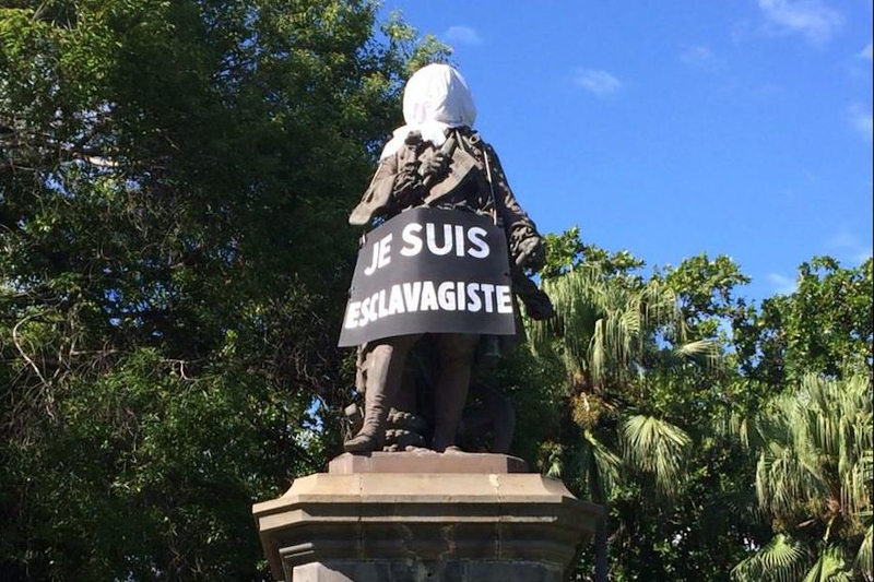 Hier war bereits im Mai 2015 vor der Präfektur in der Inselhauptstadt St-Denis der Kopf der Statue des Gouverneurs François Mahé de La Bourdonnais (1735–1746) mit einem weißen Tuch verhüllt worden und ihr Schilder mit der Aufschrift „Ich bin ein Befürworter der Sklavenhaltergesellschaft“ sowie „Ich bin Rassist“ umgehängt worden. De La Bourdonnais hatte die Insel wirtschaftlich durch die Einführung des frühindustriellen Zuckerrohranbaus zwar deutlich vorangebracht, andererseits aber auch tatkräftig die erbarmungslose Verfolgung flüchtiger Sklaven ins unwegsame Inselinnere gefördert.