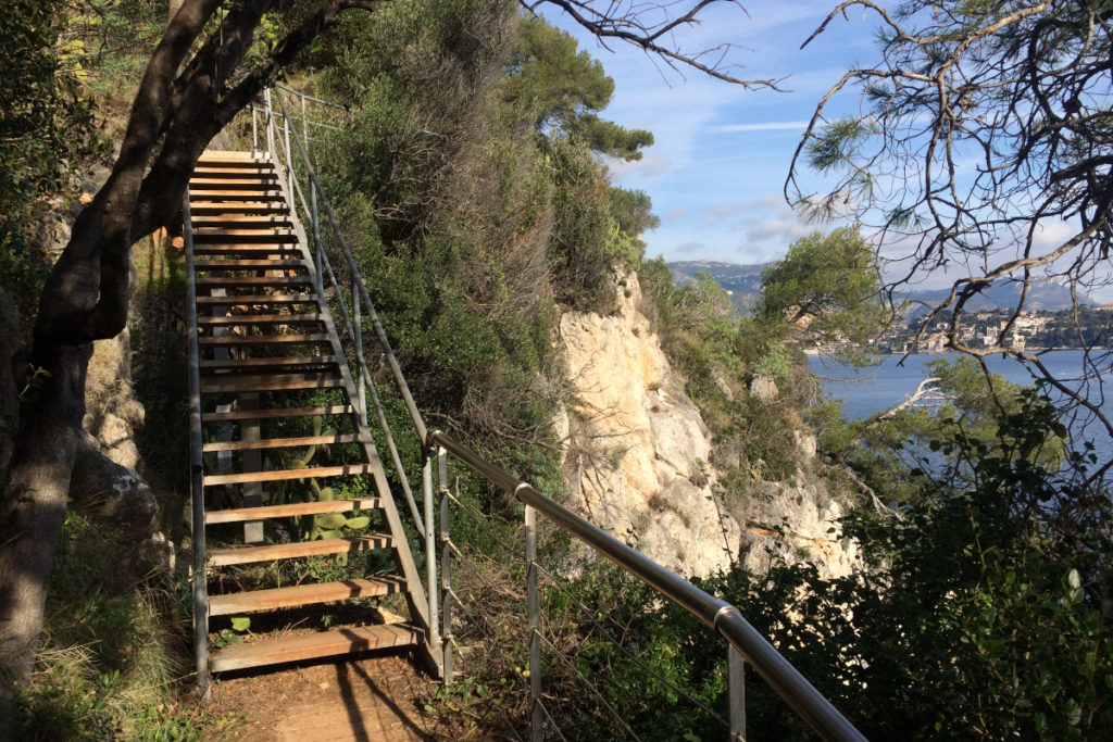 Nun geht es um das kleine östliche Kap (Treppe am Chemin de Saint-Hospice beim Paloma Beach) herum, mit prächtigen Ausblicken auf Eze, Monaco und Ligurien. Munter auf und ab führt der Weg zum eigentlichen Kap mit seinem Leuchtturm und von dort auf einem teilweise sehr schmalen Pfad in Richtung Villefranche. Hinter der Plage Passable wird der Küstenweg unterbrochen, weil dort private Anwesen stehen. Am besten hält man sich rechts und geht weiter innen in Richtung Villefranche, oder relativ schnell über den Rücken der Halbinsel zurück nach Beaulieu. Ähnlich reizvoll geht es am Cap-Martin zu. Den Weg kann man ganz im Osten von Monaco beginnen, oder auch in Cap-Martin an der Avenue Sir Winston Churchill.